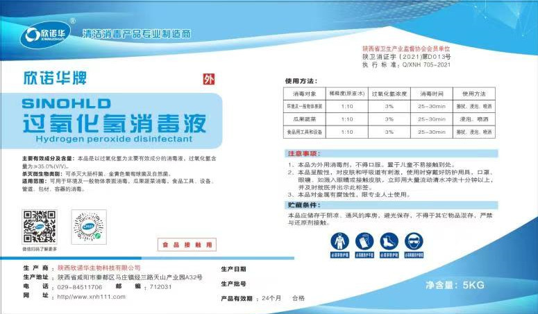 欣諾華牌8%過氧化氫消毒液陜衛(wèi)消證字2021第D013號 執(zhí)行標(biāo)準(zhǔn):Q/XNH705-2020 二:產(chǎn)品簡介及產(chǎn)品特點: 產(chǎn)品簡介:欣諾華牌8%過氧化氫消毒液是以過氧化氫為主要有效成分的液體消毒劑,有效成份含量為8.0%,可快速。徹底殺滅大腸桿菌,金黃色葡萄球菌。特別適合用于環(huán)境及一般物體表面的消毒,織物消毒