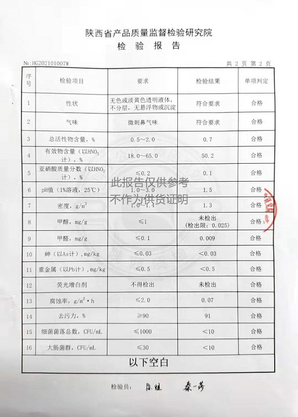 食品級(jí)酸性清洗劑檢測(cè)報(bào)告三橋牌食品工業(yè)酸性清洗劑(XNHSQ-2型)檢測(cè)報(bào)告(2021年度)