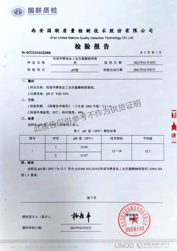 欣諾華牌食品級(jí)次氯酸鈉消毒劑檢測(cè)報(bào)告(XNH303型)(2021年度)-陜西欣諾華生物科技有限公司