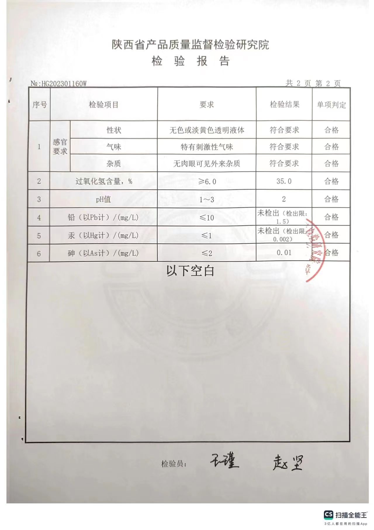 欣諾華牌過氧化氫消毒液(食品級雙氧水)檢測報告(2023年度)-陜西欣諾華生物科技有限公司