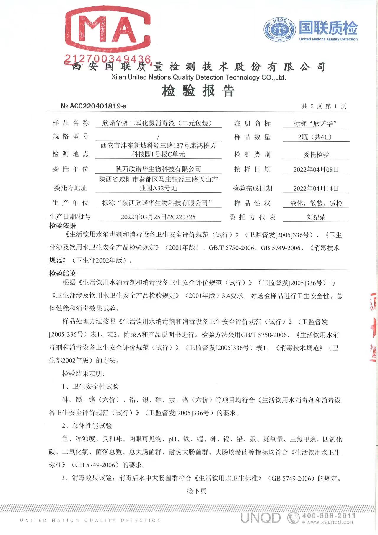 二氧化氯消毒液(商品名稱:欣諾華牌二氧化氯消毒液)第三方檢測報告,本品是以二氧化氯為主要有效成分的消毒液,主要用于生活飲用水消毒,二次供水消毒。含量:2.0%,生產(chǎn)商;陜西欣諾華生物科技有限公司,服務(wù)熱線:13991111706(微信同號)