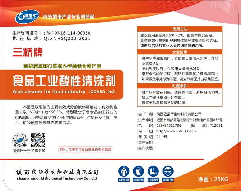三橋牌食品工業(yè)酸性清洗劑(XNHSQ-2型)是以硝酸為主要有效成分的液體清潔劑,有效成份為50%,特別適合用于食品、飲料、乳品、啤酒等行業(yè)設(shè)備,容器、管道的CIP清洗使用。
