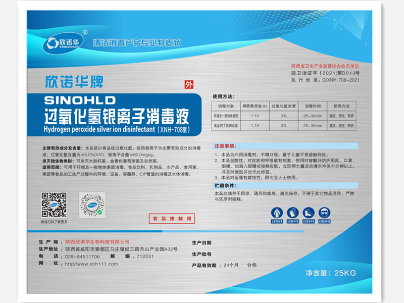 過氧化氫銀離子消毒液 過氧化氫銀離子消毒液是陜西欣諾華生物科技有限公司在借鑒國外同類型產(chǎn)品的基礎(chǔ)上,經(jīng)反復(fù)試驗(yàn),研制而成的一種新型的消毒液,產(chǎn)品具有穩(wěn)定性好,含量高,性能優(yōu)越,技術(shù)指標(biāo)完全符合國家關(guān)于食品接觸用消毒劑的要求,完全可以取代進(jìn)口產(chǎn)品,為企業(yè)降低生產(chǎn)成本,增加效益。